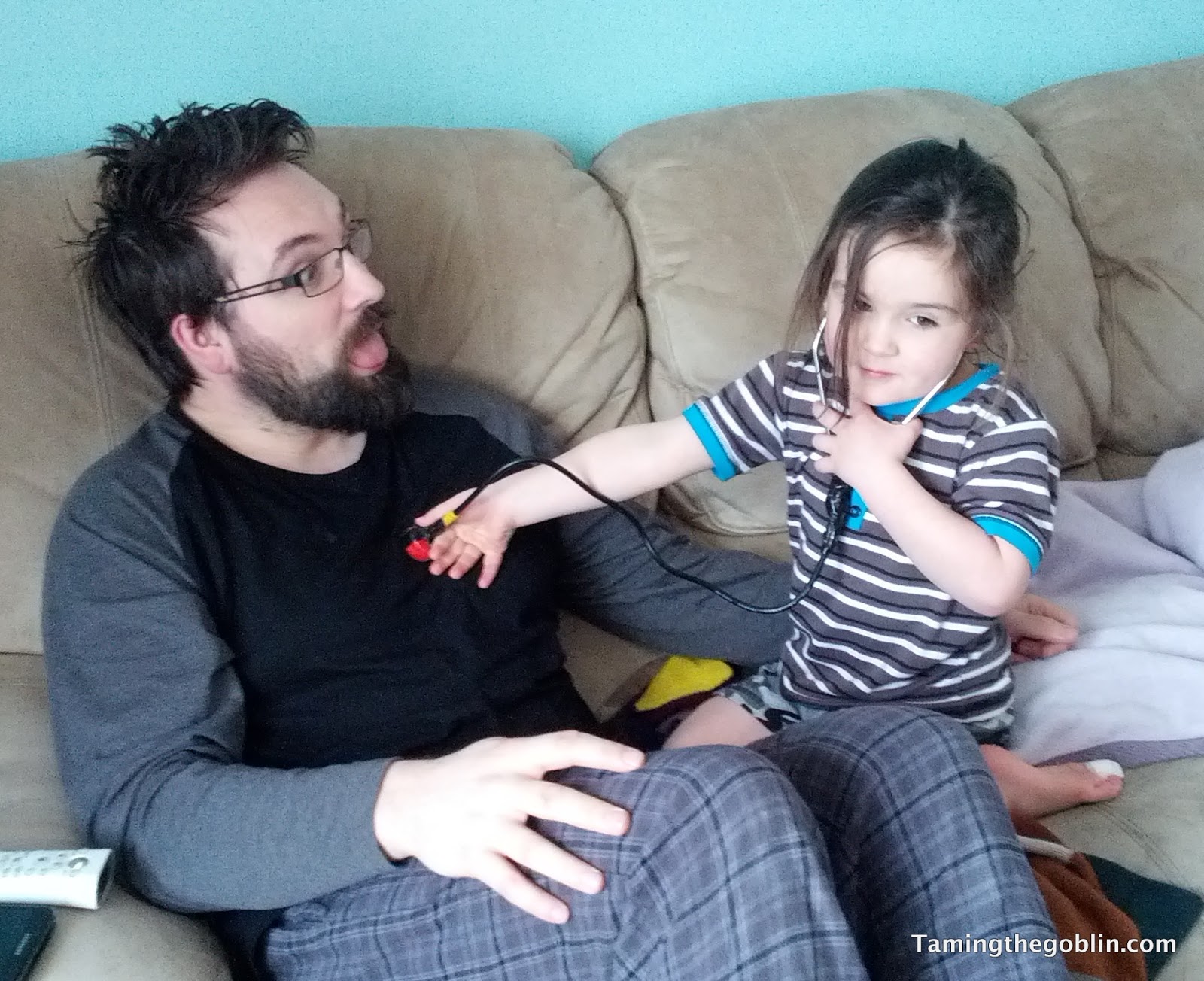 Hublet also made Goblin a thermometer using two metal straws, a computer cable, a bottle cap and lots of duct tape. This proved a hit with Goblin listening to our chests and administering medicine. And when Hublet sneezed Goblin administered a medicinal bandage under the watchful eye of the doctor.